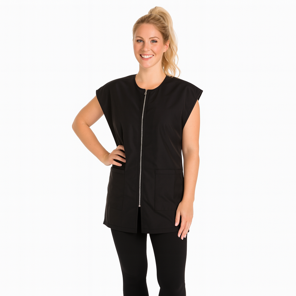 Silkara Chalecos sin mangas con cremallera de strass de Ropa de salón Ofrece la combinación perfecta de estilo, comodidad y funcionalidad. Ideales para salones u otros entornos profesionales, estos chalecos vienen en una variedad de tamaños y opciones personalizables para satisfacer sus necesidades específicas. Con acabados como incrustar diamantes de imitación alrededor de la cremallera y tener su logotipo impreso o bordado en el chaleco, puede crear una pieza que destaque y muestre su nombre o marca de una manera elegante. Ya sea que esté iniciando su propio salón o renovando los uniformes existentes, los chalecos sin mangas Silkara con cremallera de diamantes de imitación de Salonwear le brindarán el aspecto profesional que necesita.